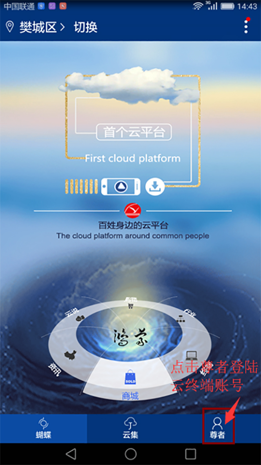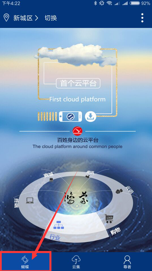 3.登陆云号后返回蝴蝶云APP首界面,点击屏幕左下方“蝴蝶”按钮。(如下图)