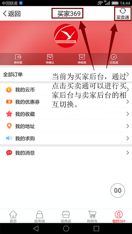 6.点击屏幕右上方“买卖通”按钮,进行买家后台与卖家后台的相互切换。